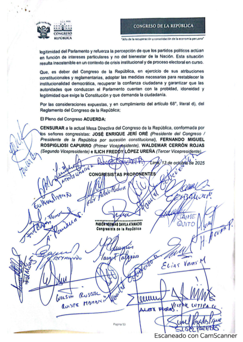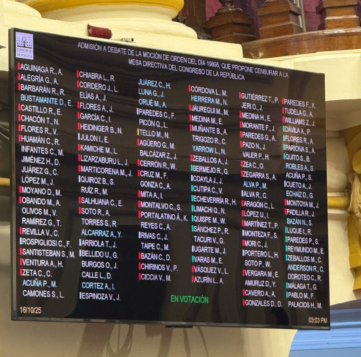 El Congreso de la República desestimó la moción de censura contra el presidente del Parlamento, José Jerí, y la Mesa Directiva. La propuesta, promovida por legisladores de izquierda en respuesta al asesinato del joven manifestante Eduardo Ruiz durante las protestas, no fue admitida a debate. La iniciativa obtuvo solo 20 votos a favor, 63 en contra y 4 abstenciones, por lo que fue archivada automáticamente. MÁS DETALLES AQUÍ