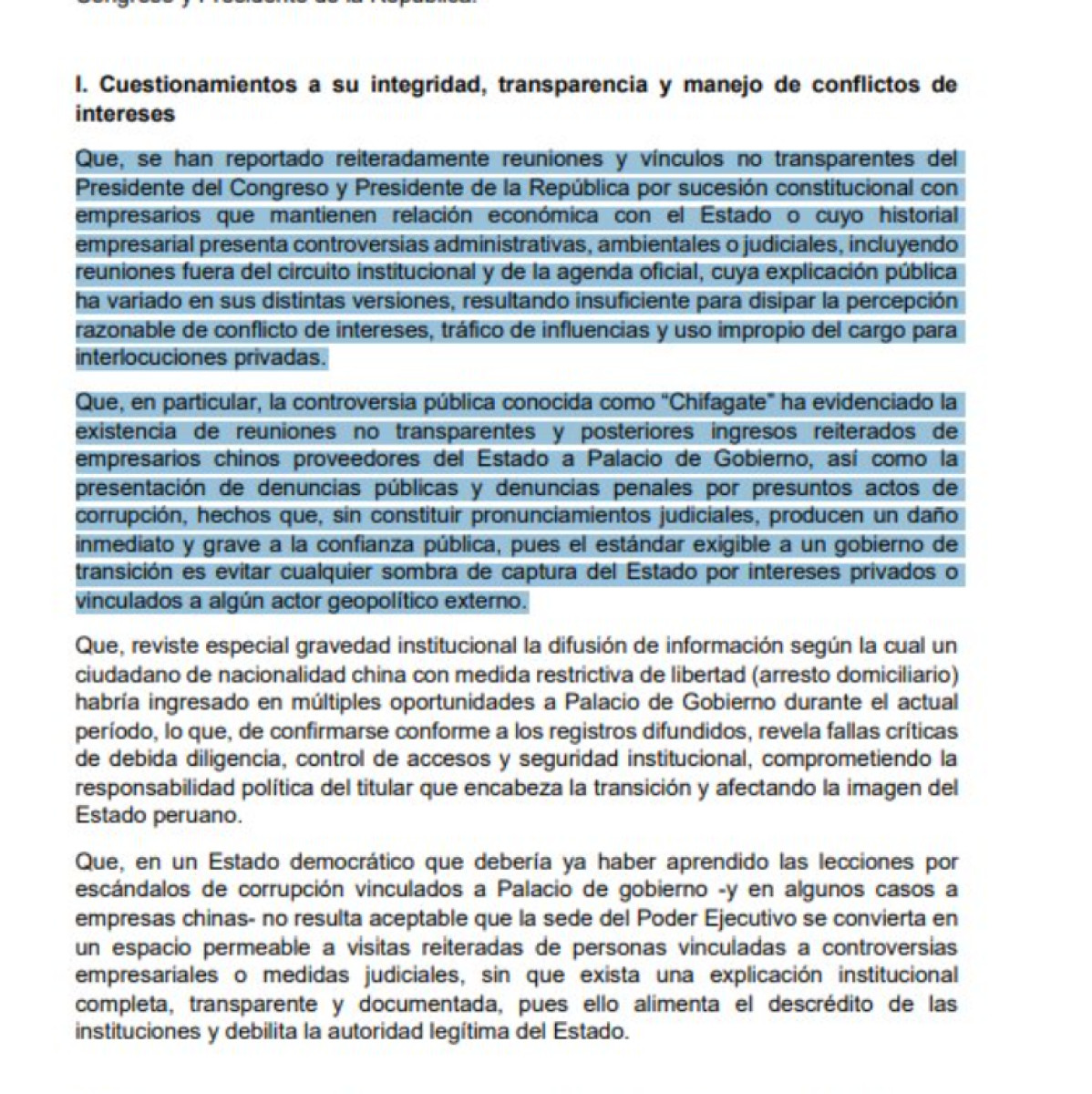 Lescano acusa a Jerí de gestiones para negocios chinos y pide su vacancia