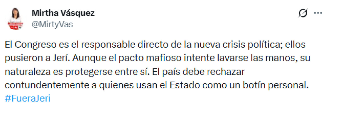 Mirtha Vásquez, candidata al Senado por Nuevo Perú, responsabilizó al Congreso por las presuntas irregularidades en la gestión de José Jerí. "El Congreso es el responsable directo de la nueva crisis política; ellos pusieron a Jerí. Aunque el pacto mafioso intente lavarse las manos, su naturaleza es protegerse entre sí. El país debe rechazar contundentemente a quienes usan el Estado como un botín personal", apuntó.