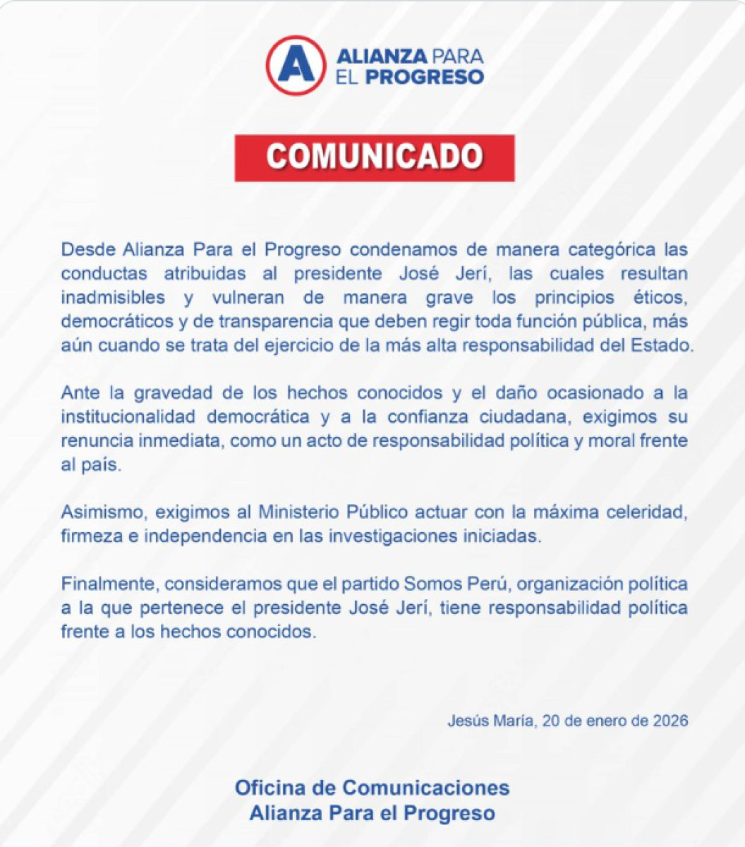 Alianza para el Progreso (APP) exigió la renuncia del presidente de la República, José Jerí, tras revelarse sus reuniones clandestinas con el empresario chino Zhihua Yang, en diciembre en un chifa de San Luis y en enero de este año en Market Capon, del Centro de Lima. Mediante un comunicado, el partido "condenó" de "manera categórica" las conductas del primer mandatario, a las que calificó como "inadmisibles". Lee más AQUÍ