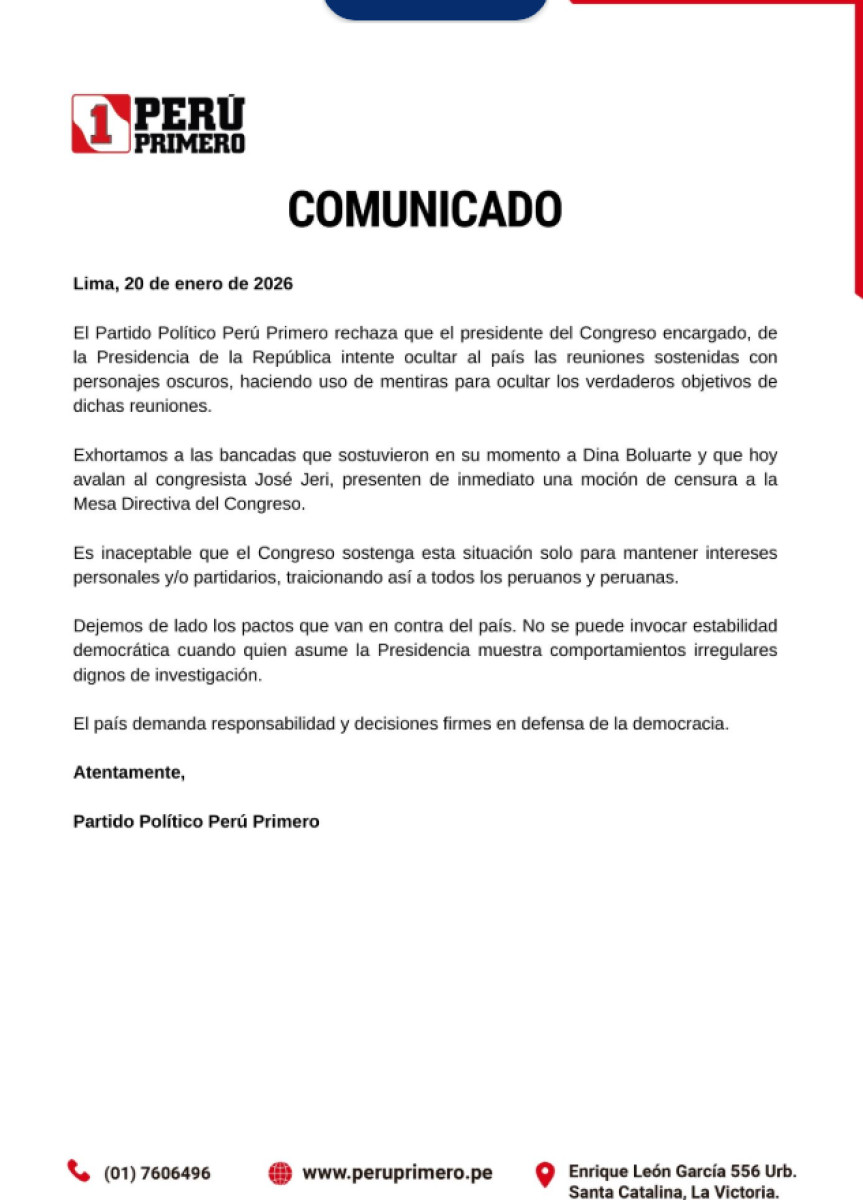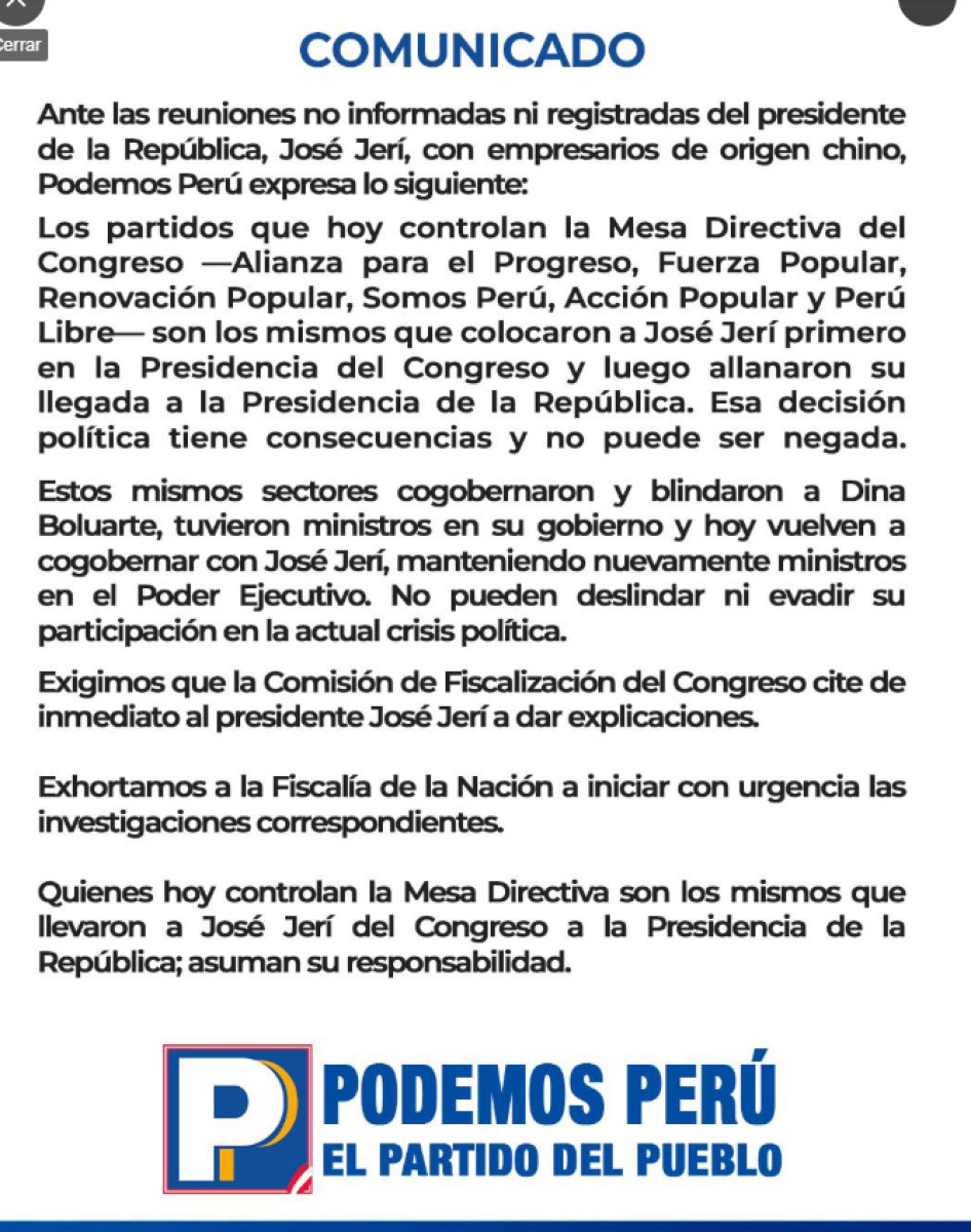 Mediante un comunicado publicado en redes socialoes, Podemos Perú pide que Jerí se presente ante la Comisión de Fiscalización del Congreso "Exhortamos que la Fiscalía de la Nación a iniciar con urgencia las investigaciones correspondientes"