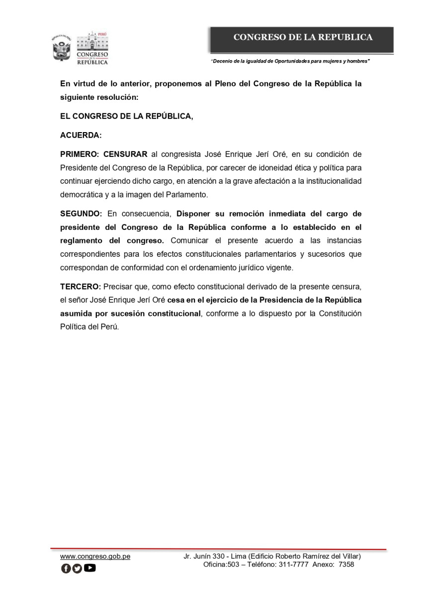 Ayer 20 de enero, su partido exigió de inmediato la renuncia de Jerí.