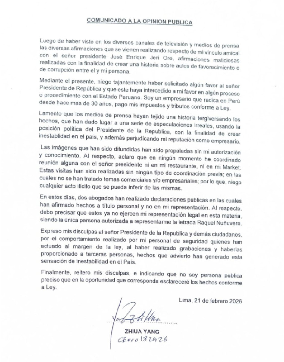El presidente de la República, José Jerí, enfrenta una situación crítica debido a sus encuentros secretos con el empresario chino Zhihua Yang. Ahora, el Congreso determinará su destino. Mientras permaneció en silencio en las redes sociales, los grupos parlamentarios comienzan a actuar. Edward Málaga, Sigrid Bazán y Ruth Luque están recolectando firmas para presentar mociones de censura en su contra; la bancada de Renovación Popular ha solicitado convocar a un Pleno Extraordinario para que Jerí brinde explicaciones sobre el asunto; y Alianza para el Progreso (APP) ya ha exigido su renuncia inmediata. MÁS DETALLES AQUÍ