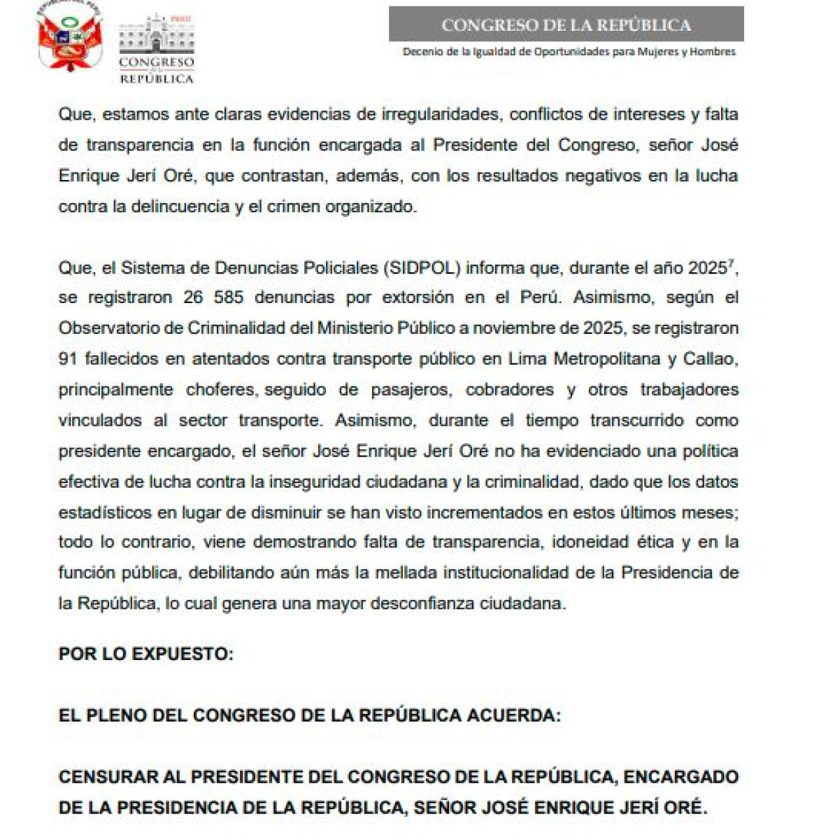 "La conducta del presidente José Jerí Oré vulnera los principios de probidad, transparencia e idoneidad en la función pública, así como evidencia un conflicto de intereses que se vendría gestando desde la posición más alta del Estado", señala el documento.