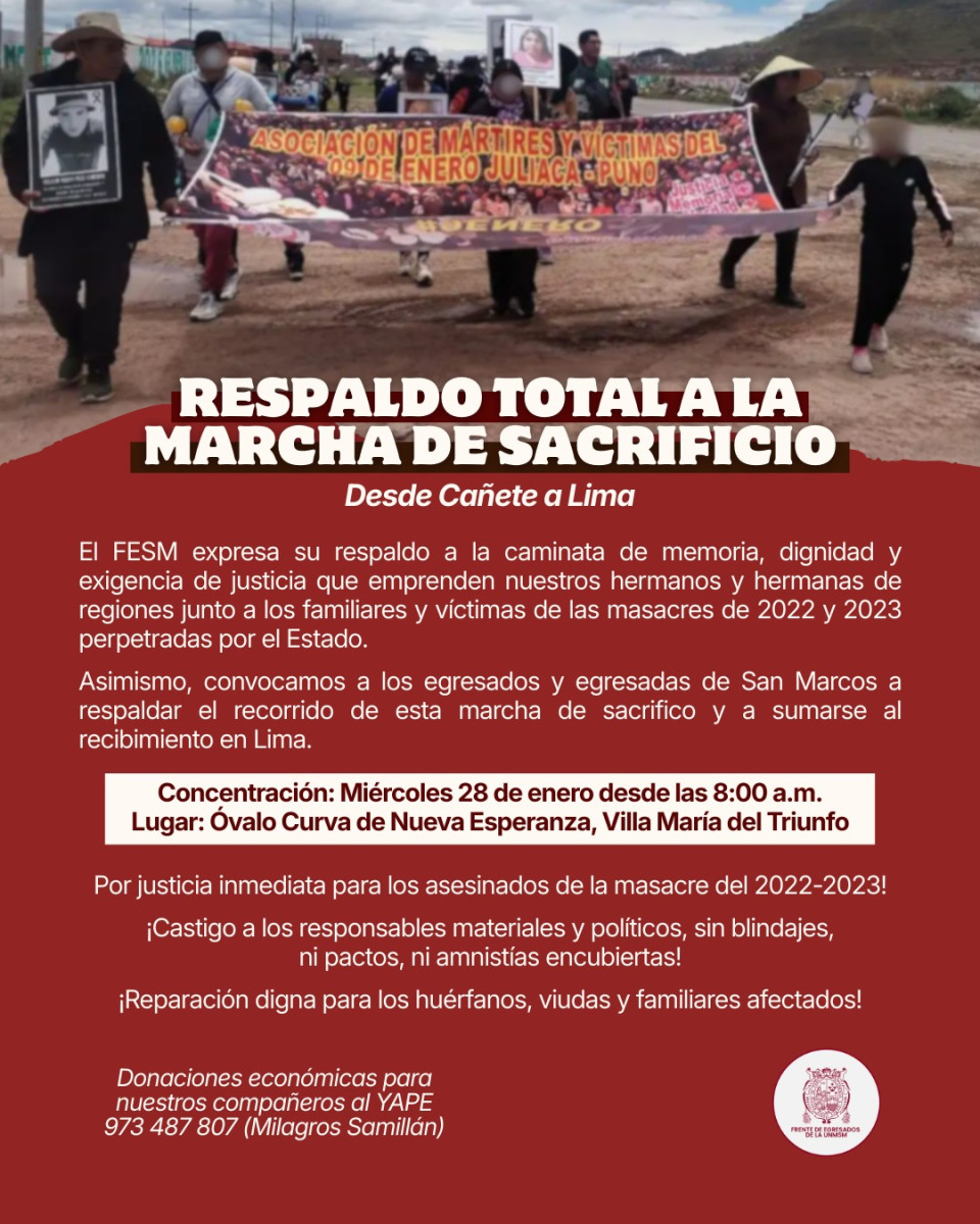 Este miércoles 28 de enero, ciudadanos de Ayacucho, Andahuaylas, Juliaca, Cusco, Pichanaqui y Huancabamba llegarán a Lima con la finalidad de protestar y exigir justicia para sus familiares que perdieron la vida durante las protestas contra el gobierno de Dina Boluarte entre 2022 y 2023. A ellos se les unirá la Generación Z, quienes confirmaron su participación en las protestas: "Marcha de sacrificio, recibimiento a los hermanos de las regiones", exclamaron. Asimismo, un sector de transportistas también se adhiere a las manifestaciones.