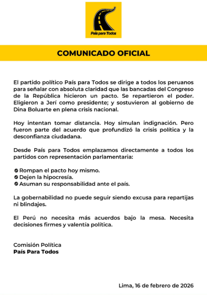 "El partido político País para Todos se dirige a todos los peruanos para señalar con absoluta claridad que las bancadas del Congreso de la República hicieron un pacto. Se repartieron el poder, eligieron a Jerí como presidente y sostuvieron el gobierno de Dina Boluarte en plena crisis nacional", se lee en el comunicado.