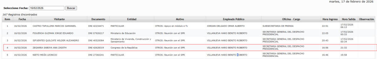 La congresista Ana Zegarra acudió a Palacio de Gobierno el último lunes 16 de febrero horas antes de que se debatan las mociones de censura contra el presidente José Jerí. Según el registro de visitas del Despacho presidencial, la parlamentaria ingresó a las 4:56 p.m. y salió a las 9:32 p.m. con el motivo de una reunión con el jefe de Estado.