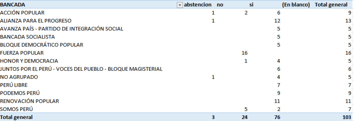 Con 73 votos a favor, 25 en contra y 0 abstenciones, el Pleno del Congreso aprobó admitir a debate la tercera moción de censura contra José Jerí. A diferencia de la segunda, hubo 4 votos a favor más y 1 voto en contra menos.