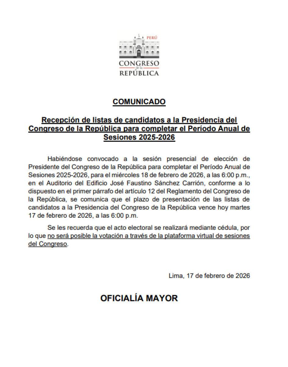 José Jerí ha sido destituido de su cargo, lo que conlleva la elección de un nuevo presidente. El presidente del Congreso, Fernando Rospigliosi (Fuerza Popular), ha anunciado que los candidatos podrán presentar sus postulaciones hasta hoy, 17 de febrero, a las 6 de la tarde. Posteriormente, mañana 18 de febrero, también a las 6 de la tarde, se llevará a cabo el debate y la votación para elegir al nuevo presidente del Perú.