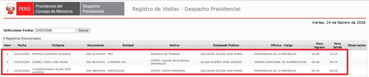 Presidente José María Balcázar aún sigue sosteniendo reuniones en Palacio de Gobierno. El mandatariosostuvo un encuentreo con la secretaria general del Ministerio de Economía y Finanzas (MEF), Rosario Riofrío Espinoza. Además se registró la visita de Felix Choquehuanca Aller, militante de Somos Perú