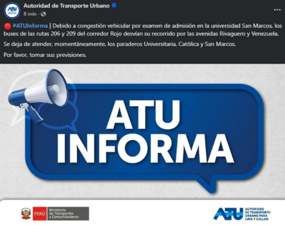 La Autoridad de Transporte Urbano para Lima y Callao informó que, debido a la congestión vehicular en los alrededores de la Universidad Nacional Mayor de San Marcos, los buses de las rutas 206 y 209 del corredor Rojo están desviando su recorrido por las avenidas Venezuela y Universitaria.