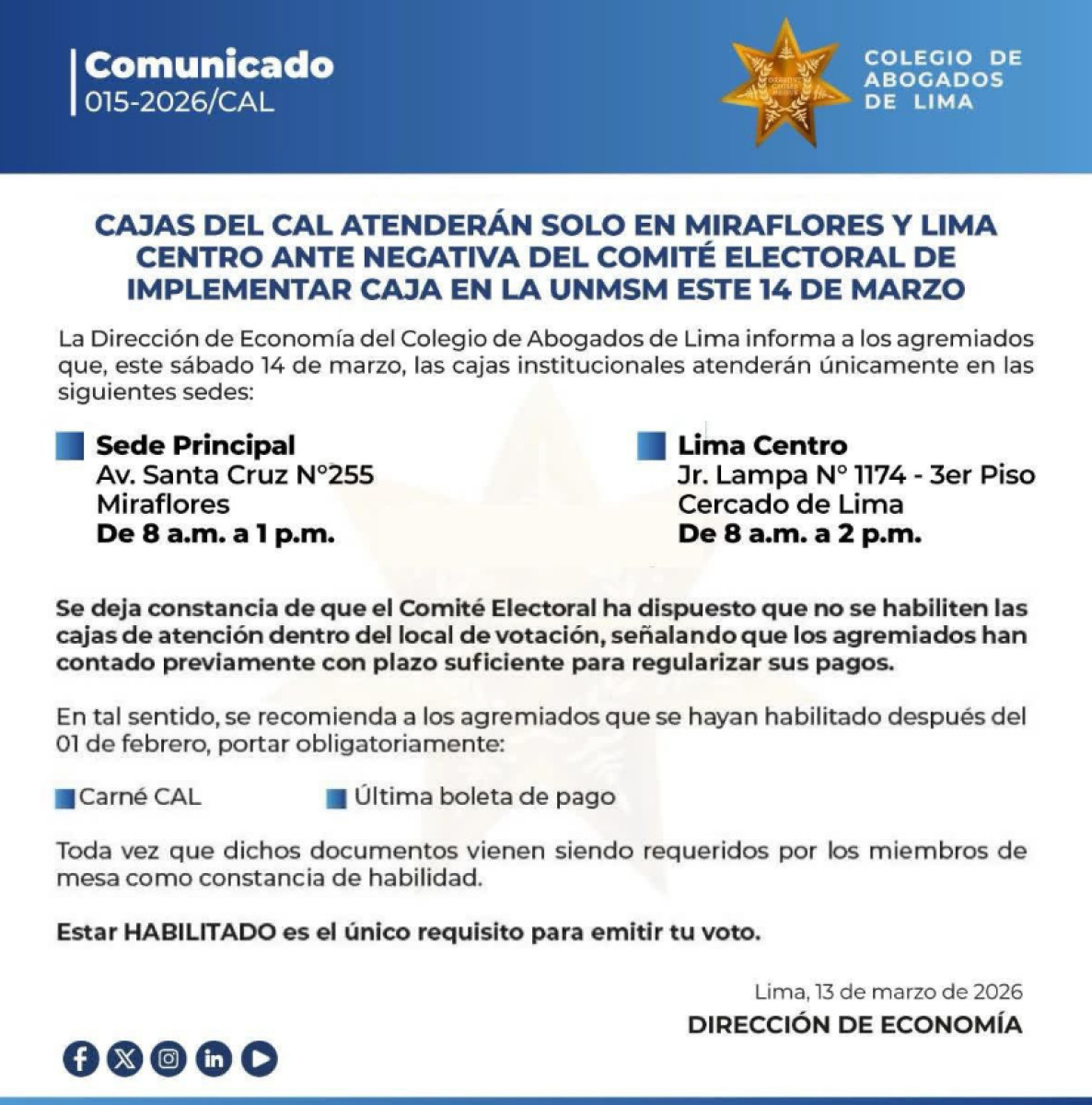 El Colegio de Abogados de Lima informó que este 14 de marzo sus cajas institucionales funcionarán únicamente en las sedes de Miraflores y Lima Centro. La medida responde a que el Comité Electoral decidió no habilitar cajas dentro del local de votación en la Universidad Nacional Mayor de San Marcos.