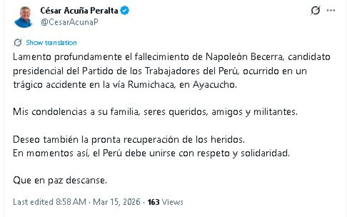 "Lamento profundamente el fallecimiento de Napoleón Becerra, candidato presidencial del Partido de los Trabajadores del Perú, ocurrido en un trágico accidente en la vía Rumichaca, en Ayacucho. Mis condolencias a su familia, seres queridos, amigos y militantes. Deseo también la pronta recuperación de los heridos. En momentos así, el Perú debe unirse con respeto y solidaridad. Que en paz descanse", expresó César Acuña, de Alianza para el Progreso (APP).