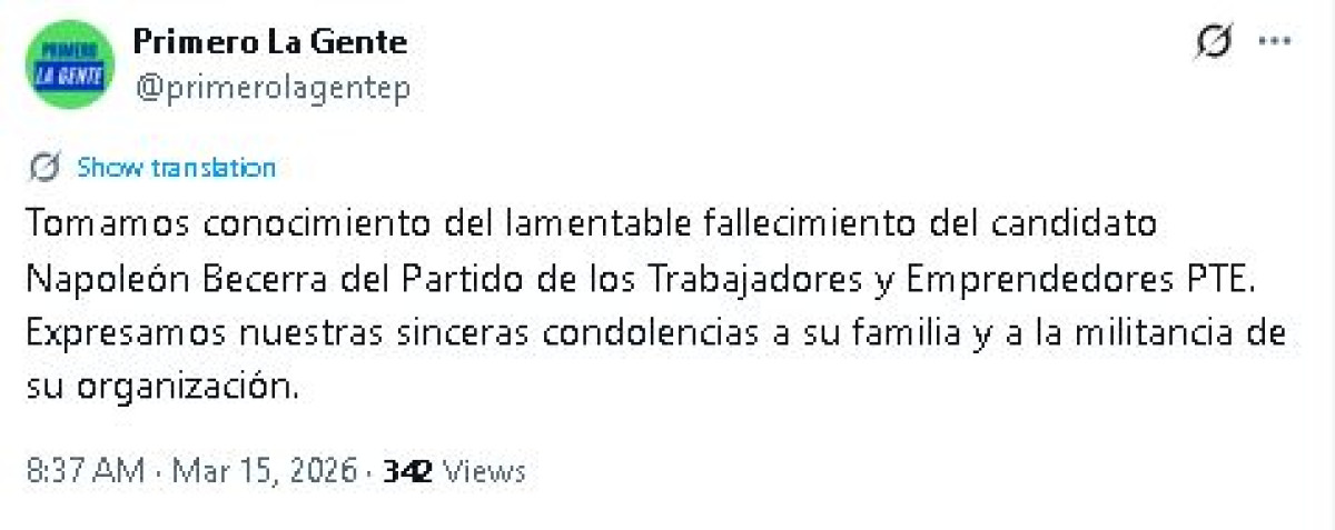 "Tomamos conocimiento del lamentable fallecimiento del candidato Napoleón Becerra del Partido de los Trabajadores y Emprendedores (PTE). Expresamos nuestras sinceras condolencias a su familia y a la militancia de su organización", lamentó Primero la Gente, quien lleva a Marisol Pérez Tello como candidata presidencial.