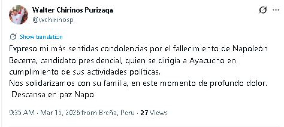 "Expreso mis más sentidas condolencias por el fallecimiento de Napoleón Becerra, candidato presidencial, quien se dirigía a Ayacucho en cumplimiento de sus actividades políticas. Nos solidarizamos con su familia, en este momento de profundo dolor. Descansa en paz, Napo. Quienes no tenemos la economía y el financiamiento empresarial tenemos que ser ruteros o mochileros, pero nada nos detiene en nuestro amor por un Perú mejor", escribió Walter Chirinos del PRIN.