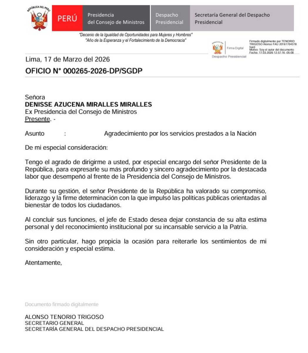 "La Presidencia de la República del Perú agradece a la señora Denisse Miralles por los servicios prestados a la nación como presidenta del Consejo de Ministros en un contexto importante para el país, y le desea éxitos en su carrera profesional y en sus futuros desafíos", comunicó Presidencia en su cuenta de X.