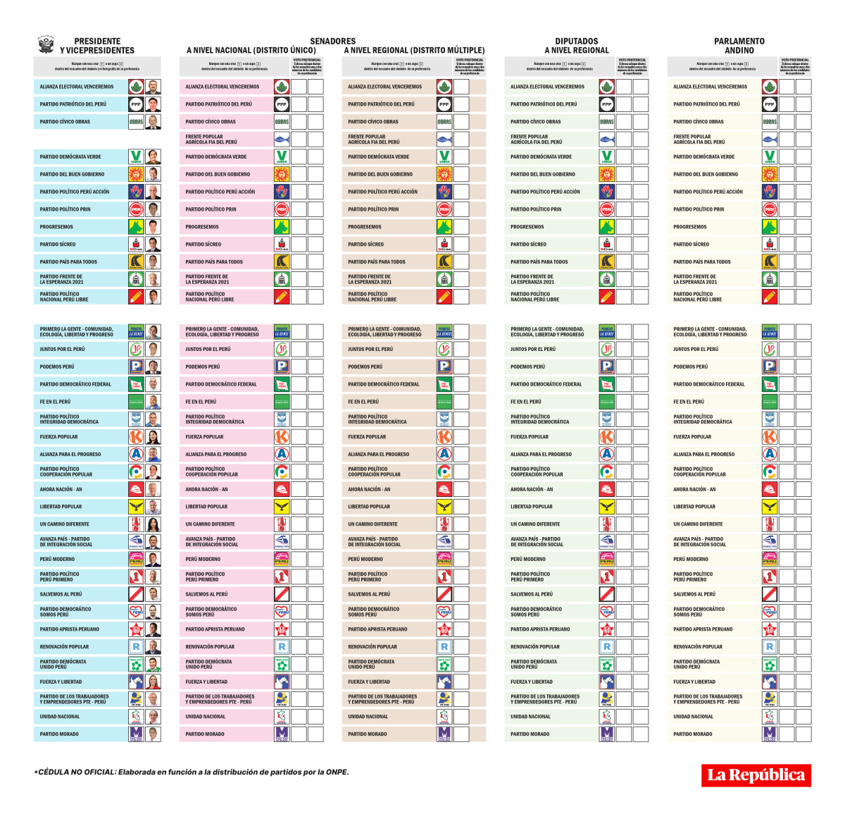 Esta cédula de votación será la más grande de nuestra historia, por lo que debes tener en cuenta que existen 4 elecciones distintas: Presidencial, Cámara de Senado, Cámara de Diputados y Parlamento Andino. Debes tener en cuenta, además, que en el caso del Senado podrás votar por el senado nacional y senados regionales.