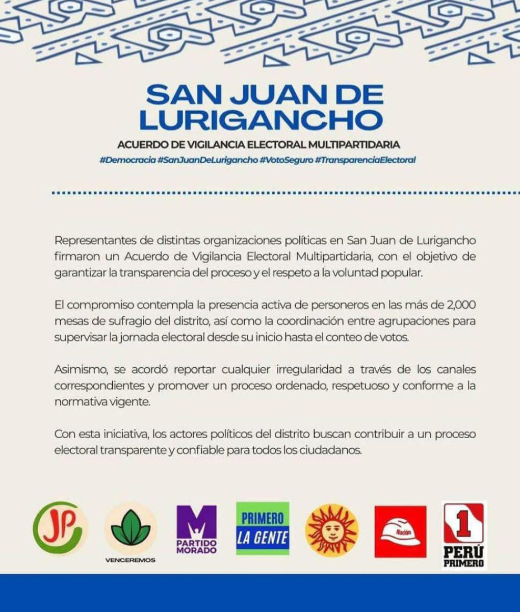 Representantes de diversas organizaciones políticas en San Juan de Lurigancho suscribieron un acuerdo multipartidario para supervisar la transparencia del proceso electoral.