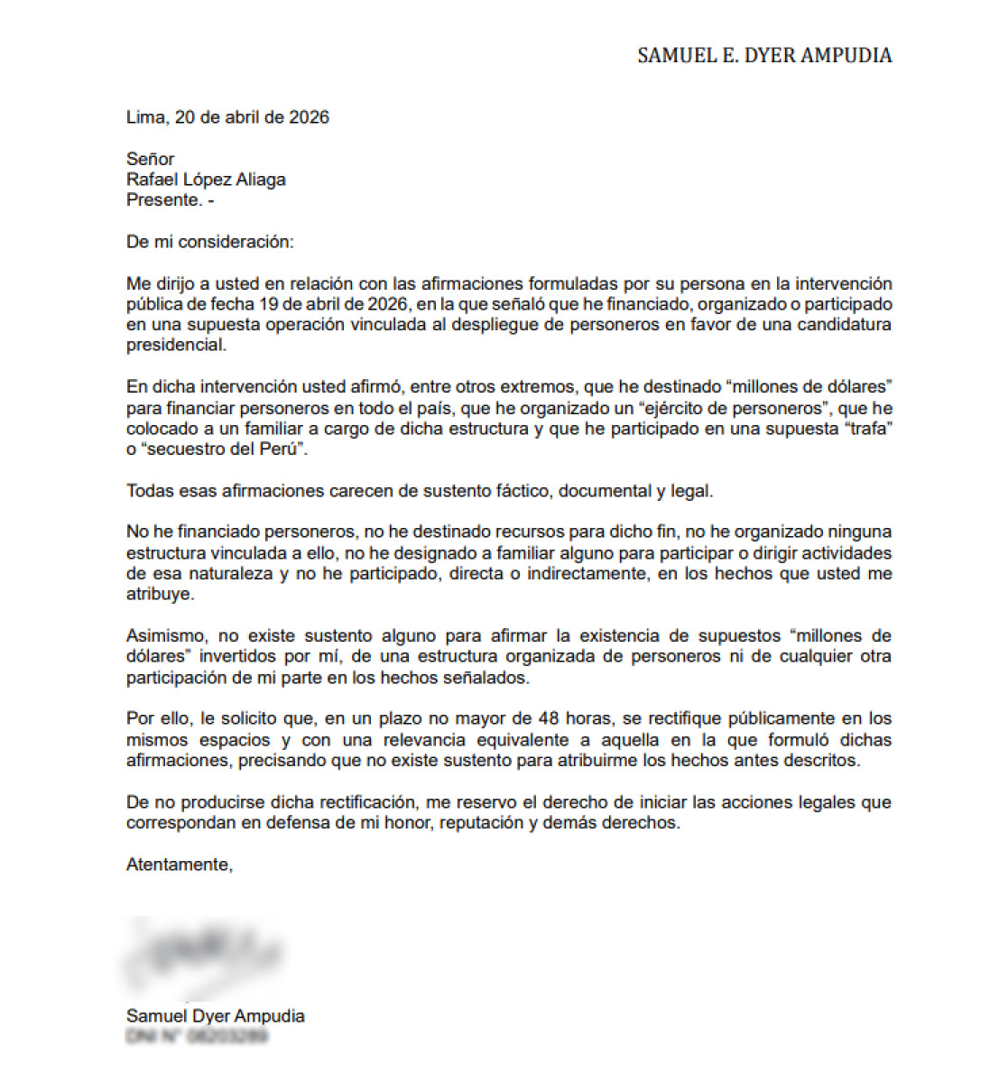 El empresario Samuel Dyer envió una carta notarial a Rafael López Aliaga para exigir una rectificación pública en un plazo de 48 horas.