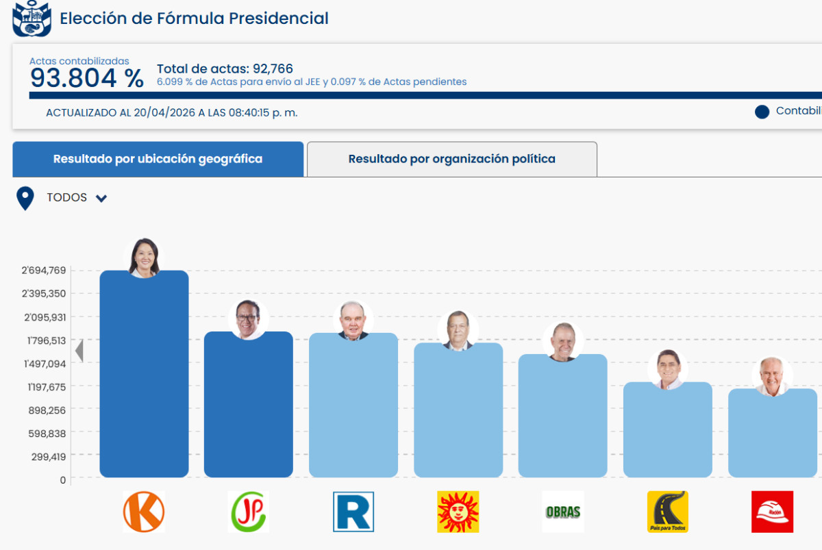 En la etapa decisiva del conteo oficial, la Oficina Nacional de Procesos Electorales (ONPE) reportó el 93,804% de actas procesadas en las Elecciones Generales 2026. Según estos resultados presidenciales, Keiko Fujimori (Fuerza Popular) lidera con 17,050% de los votos, seguida por Roberto Sánchez con 12,006%, mientras Rafael López Aliaga ocupa el tercer lugar con 11,919%. Cabe señalar que el candidato de Renovación Popular insiste en una supuesta narrativa de fraude en su contra.