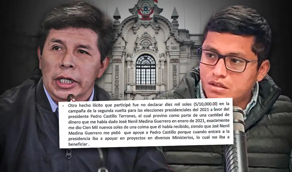“Otro hecho ilícito (del) que participé fue no declarar S/ 10.000 en la campaña de la segunda vuelta para las elecciones presidenciales del 2021 a favor del presidente Pedro Castillo Terrones, el cual provino como parte de una cantidad de dinero que me había dado José Nenil Medina Guerrero en enero de 2021, exactamente me dio 100.000 nuevos soles de una coima que él había recibido, siendo que José Nenil Medina Guerrero me pidió que apoye a Pedro Castillo porque cuando entrara a la presidencia iba a apoyar en proyectos en diversos ministerios, lo cual nos iba a beneficiar”, confesó el empresario y amigo de la también investigada Yenifer Paredes.