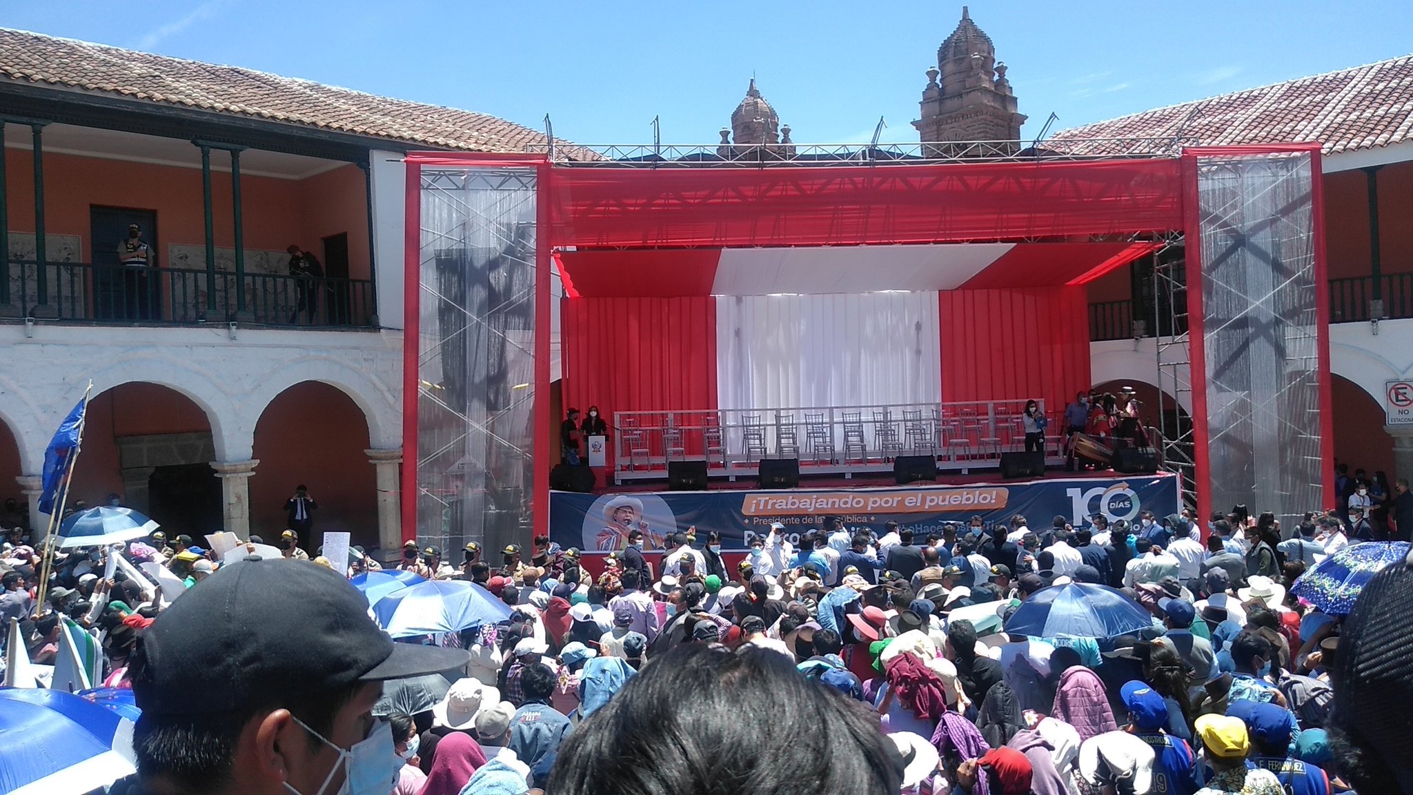 Con casi una hora de retraso inició la ceremonia para la presentación del informe de los 100 primeros días del mandato de Pedro Castillo. El gobernador de dicha región, Carlos Rúa, durante su intervención pidio la masificación del gas para esa parte del país.