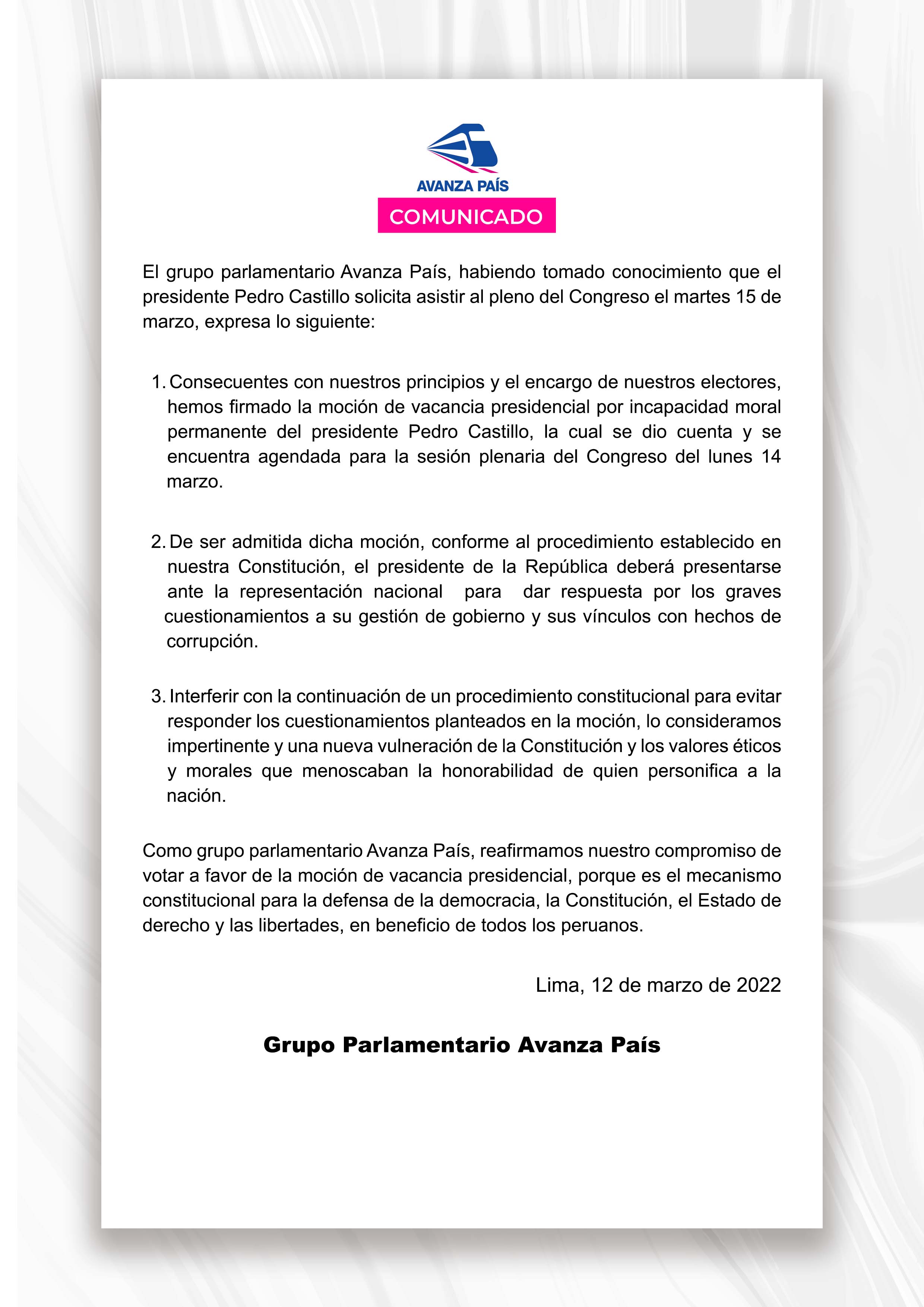 La bancada de Avanza País acusó este sábado al presidente Pedro Castillo de interferir el proceso de vacancia en su contra, el cual se reanudará este 14 de marzo.