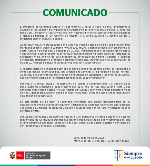 A través de su cuenta de Twitter, el Ministerio de Desarrollo Agrario y Riego del Perú lamentó los hechos ocurridos en Arequipa por el paro de transportistas. En ese sentido, desde la cartera señalaron lo siguiente: "pedimos a nuestros hermanos de la Agricultura, ganadería, juntas de riego y transporte a dialogar con los representas que enviamos a mesas de trabajos en diversas regiones."