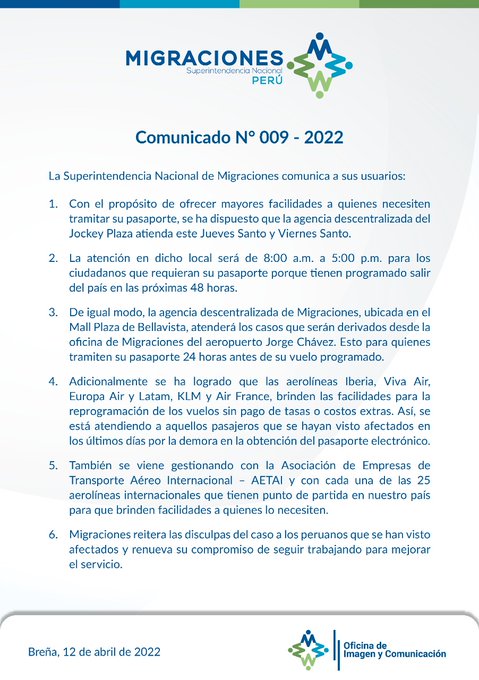 Mediante un pronunciomiento, la entidad informó que se ha dispueto que la agencia descentralziada de Jockey Plaza atienda este jueves y viernes santo desde las 8.00 a. m. hasta las 5 a. m.
