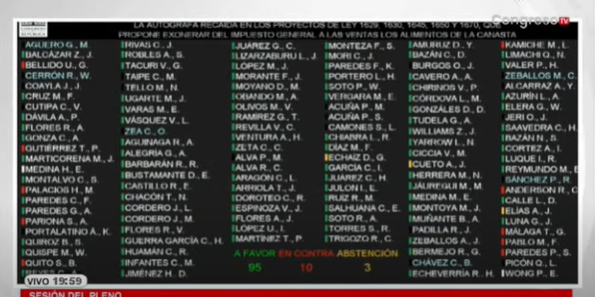 El Congreso de la República aprobó por votación la ley que exonera el IGV a los alimentos de la canasta básica con 95 votos a favor, 10 en contra y 3 abstenciones.