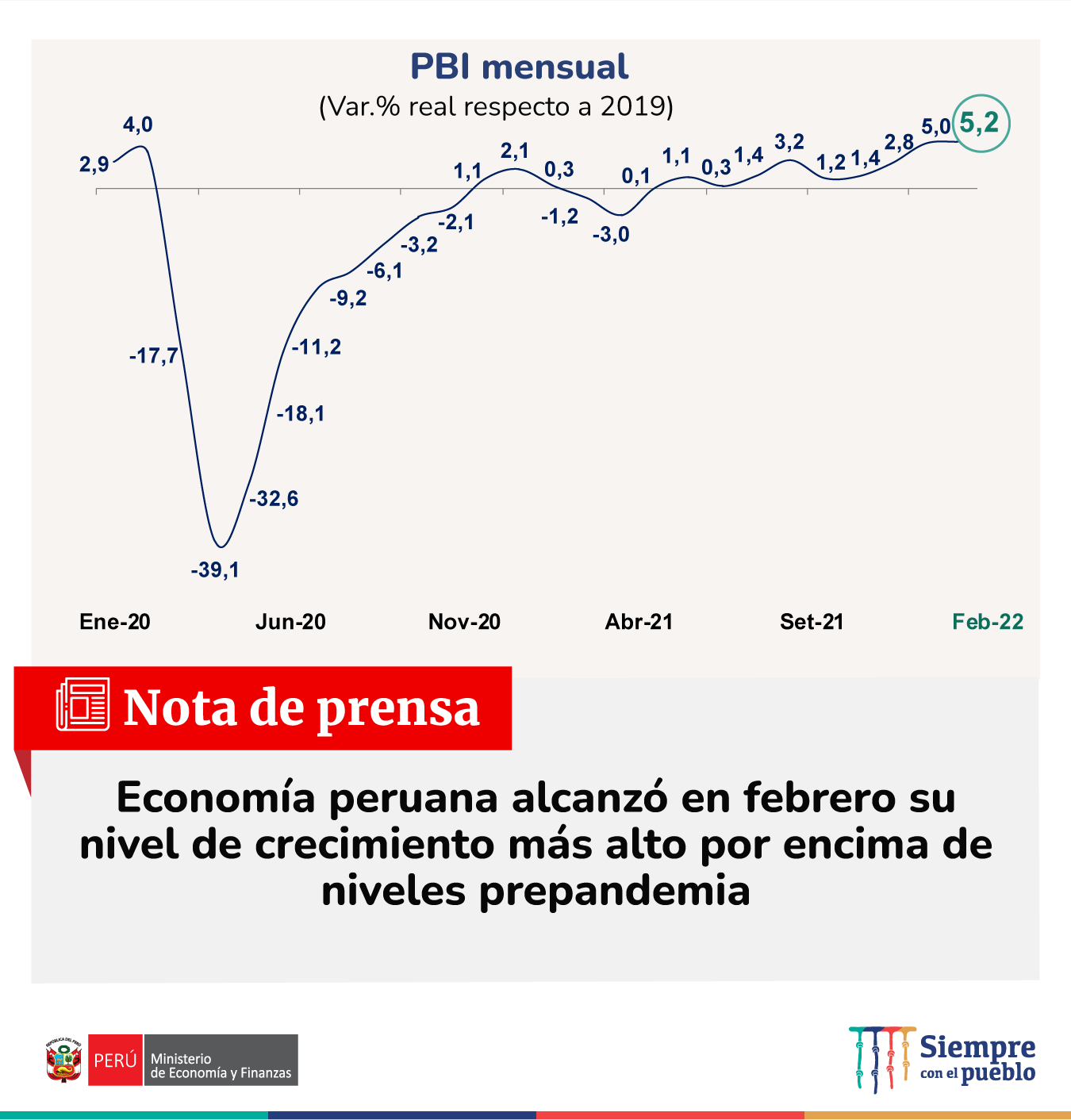 "En febrero la economía peruana creció 5,2% frente al PBI registrado antes de la pandemia de la COVID 19, en febrero de 2019, crecimiento que es resultado, principalmente, de la recuperación de los sectores afectados por la pandemia".