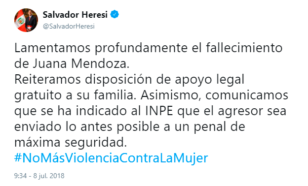 Heresi dispone trasladar a agresor de Juanita Mendoza a penal de máxima seguridad