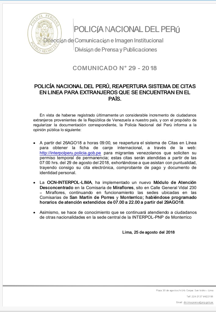 PNP reapertura sistema de citas en línea para venezolanos que viven en Perú