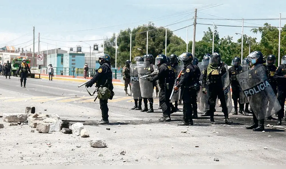Choques. Policía despejó vías disparando gases lacrimógenos y perdigones. Manifestantes respondieron lanzando piedras. Hubo detenidos en Arequipa y Tacna.