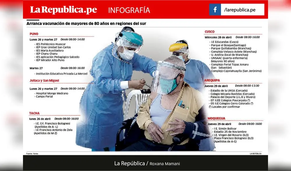 Estrategias. Tacna y Puno serán las primeras en inmunizar a sus adultos mayores de 80 años en colegios e institutos. En Cusco vacunación durará 4 días. En Moquegua se hará por orden alfabético y en Arequipa, se empezará en cuatro distritos.