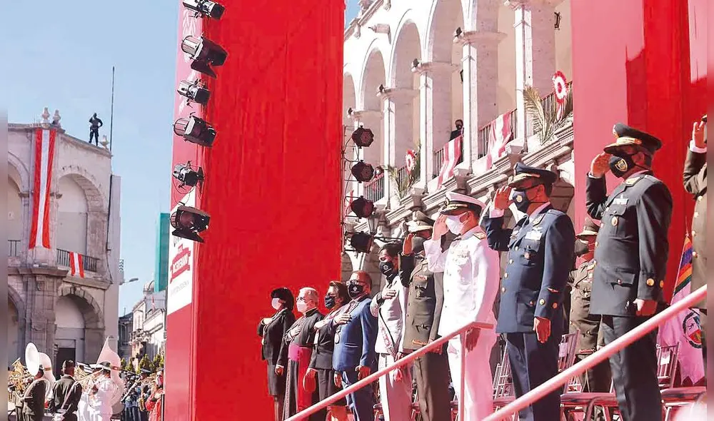En la región Arequipa, la ceremonia protocolar se realizó en la Plaza de Armas de la ciudad y convocó a diversas autoridades, quienes además de rememorar a los precursores libertarios de la patria, rindieron honores a los cientos de muertos por la COVID-19 y conmemoraron a los nuevos héroes del Bicentenario: el personal de primera línea que batalla contra la pandemia en diversas instituciones.