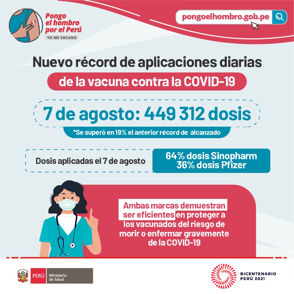 El Ministerio de Salud (Minsa) informó que durante la cuarta vacunatón realizada el pasado 7 de agosto se alcanzó un nuevo récord de personas inmunizadas en un solo día, ya que se aplicaron 449.312 dosis de la vacuna contra la COVID-19.