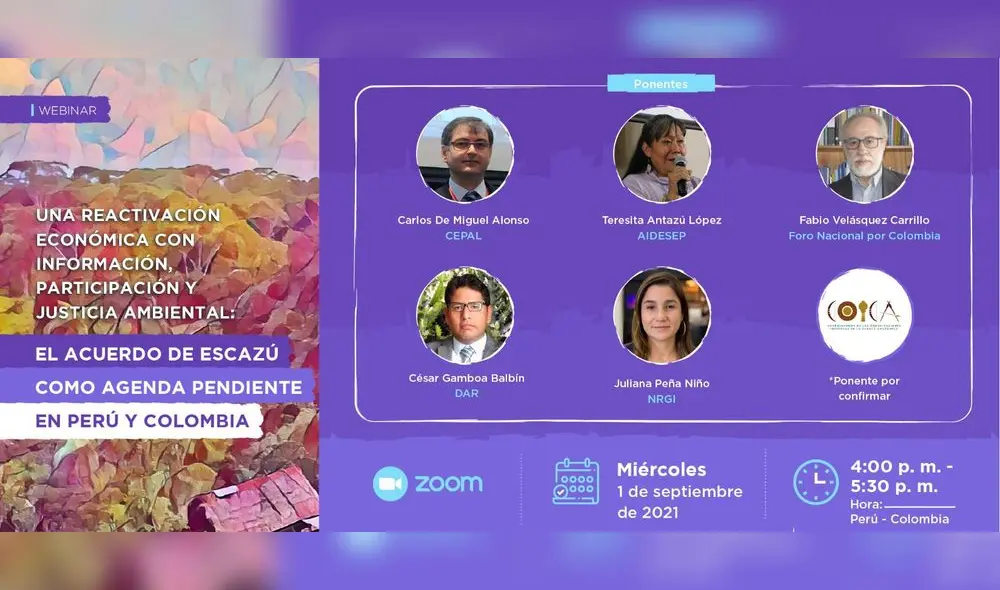 Buscando visibilizar y recordar la importancia del acuerdo de Escazú se realizará este 1 de setiembre el webinar: “Una reactivación económica con Información, Participación y Justicia Ambiental: El Acuerdo de Escazú como agenda pendiente en Perú y Colombia”.