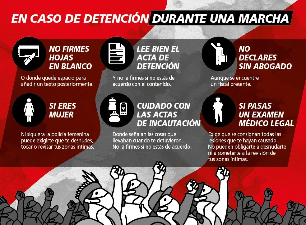 La Coordinadora Nacional de Derechos Humanos (CNDDHH) indicó que, ante una detención en una marcha, no se debe firmar ningún papel en blanco y solo se debe declarar con un abogado presente. A continuación, más recomendaciones: