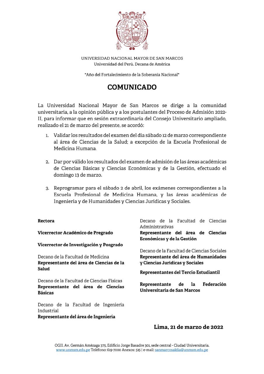 Finalmente, autoridades sanmarquinas determinaron que postulantes de las áreas de Medicina e Ingenierías vuelvan a rendir la prueba de admisión el sábado 2 de abril junto a los aspirantes del bloque de Letras. Todos ellos realizarán el examen en el Estadio de San Marcos.