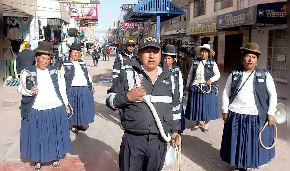 Puno. Orlando Sanga Yampasi, camina chicote en mano, por inmediaciones del mercado Tupac Amaru de Juliaca. En su condición de presidente de las Rondas Urbanas de San Román, es el responsable de que las cosas que no salgan de control al momento de hacerle frente a la delincuencia. Lo acompañan en su tarea varias mujeres que cumplen una función importante. Debido a su género ponen equilibrio.