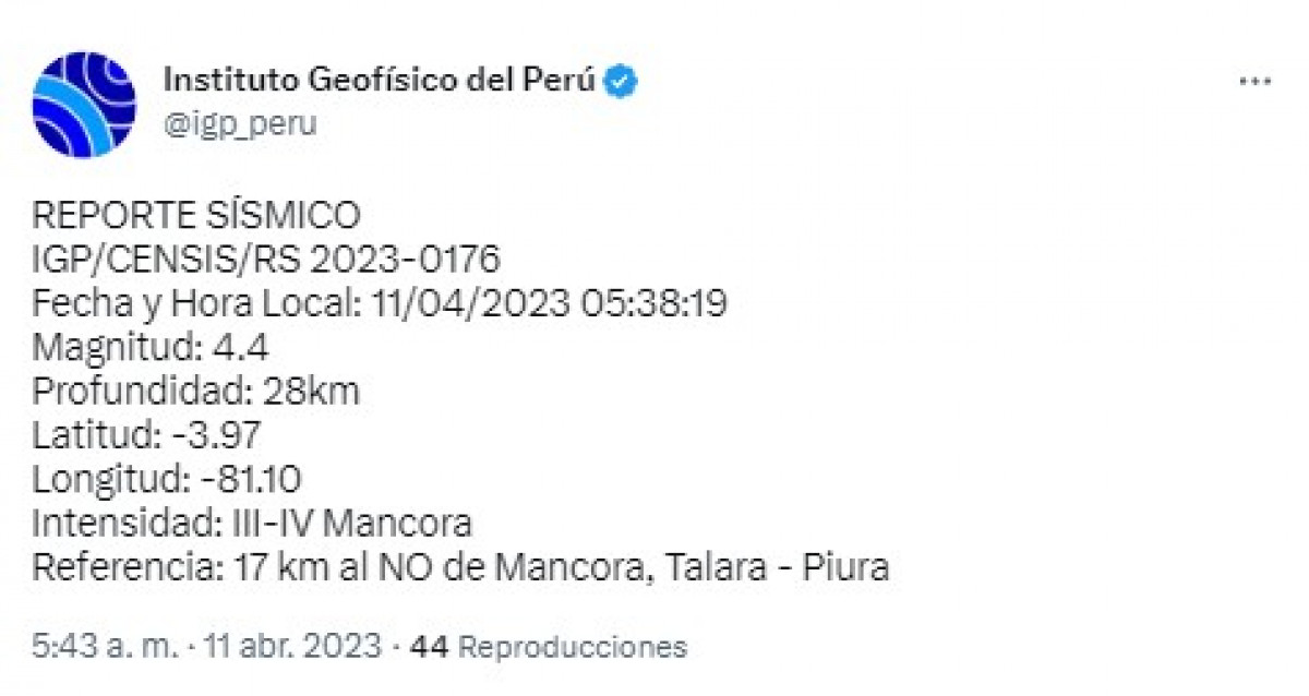 Un sismo de magnitud 4.4 se registró a las 5:38 a. m. a 17 kilómetros al noroeste de Máncora, departamento de Piura. El temblor del 11 de abril de 2023, tuvo una profundidad de 28 kilómetros, según informó el Instituto Geofísico del Perú (IGP) vía Twitter. Recuerda tener siempre lista una mochila de emergencia para estar preparado ante un desastre natural.