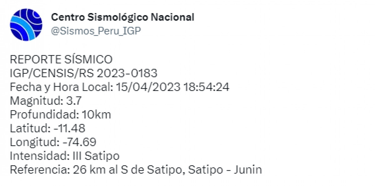 Un sismo de magnitud 3.7 se registró a las 18:54 de la tarde a 26 kilómetros al oeste de Satipo, Junín. El temblor del 15 de abril de 2023 ocurrió a una profundidad de 23 kilómetros, según informó el Instituto Geofísico del Perú (IGP) vía Twitter.