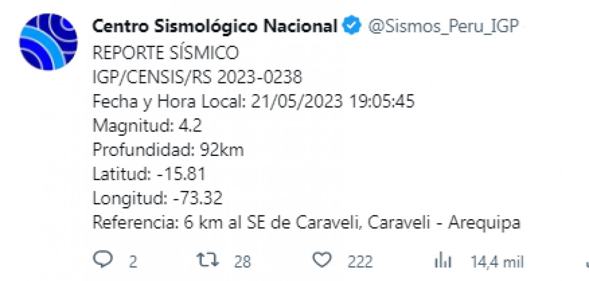 Un sismo de magnitud 4.2 se registró a las 19.05 p. m. a 6 kilómetros al sureste de Caraveli, departamento de Arequipa. El temblor de ayer, 21 de mayo de 2023, se registró a una profundidad de 92 kilómetros, según informó el Instituto Geofísico del Perú (IGP) vía Twitter. Recuerda tener siempre lista una mochila de emergencia para estar preparado ante un desastre natural