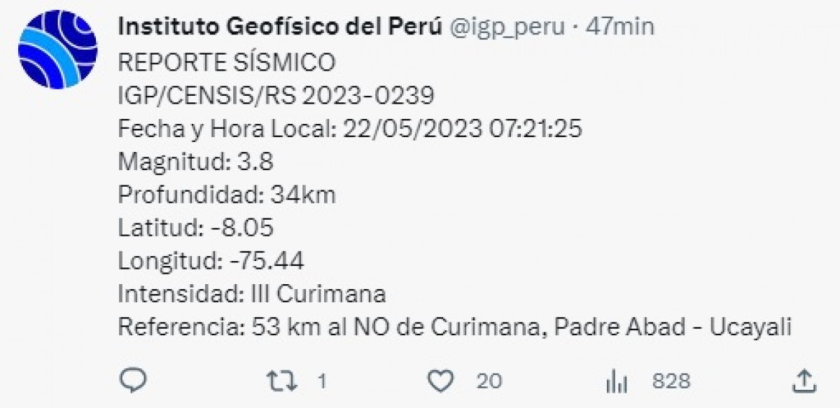 Un sismo de magnitud 3.8 se registró a las 07.21 p. m. a 53 kilómetros al noroeste de Curimana, departamento de Ucayali. El temblor de hoy, 22 de mayo de 2023, se registró a una profundidad de 34 kilómetros, según informó el Instituto Geofísico del Perú (IGP) vía Twitter. Recuerda tener siempre lista una mochila de emergencia para estar preparado ante un desastre natural