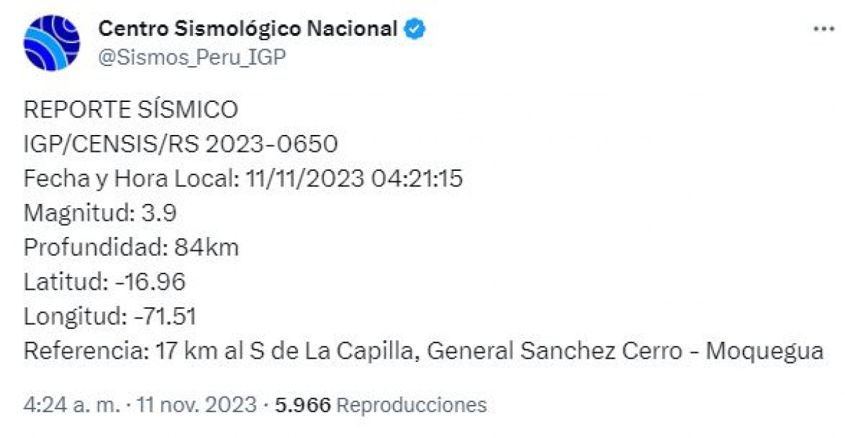 Un sismo de 3.9 se produjo este 11 de noviembre, según reportó el IGP. El movimiento telúrico tuvo una profundidad de 84 kilómetros, así como también una referencia de 17 kilómetros al sur de La Capilla, General Sánchez Cerro - Moquegua.