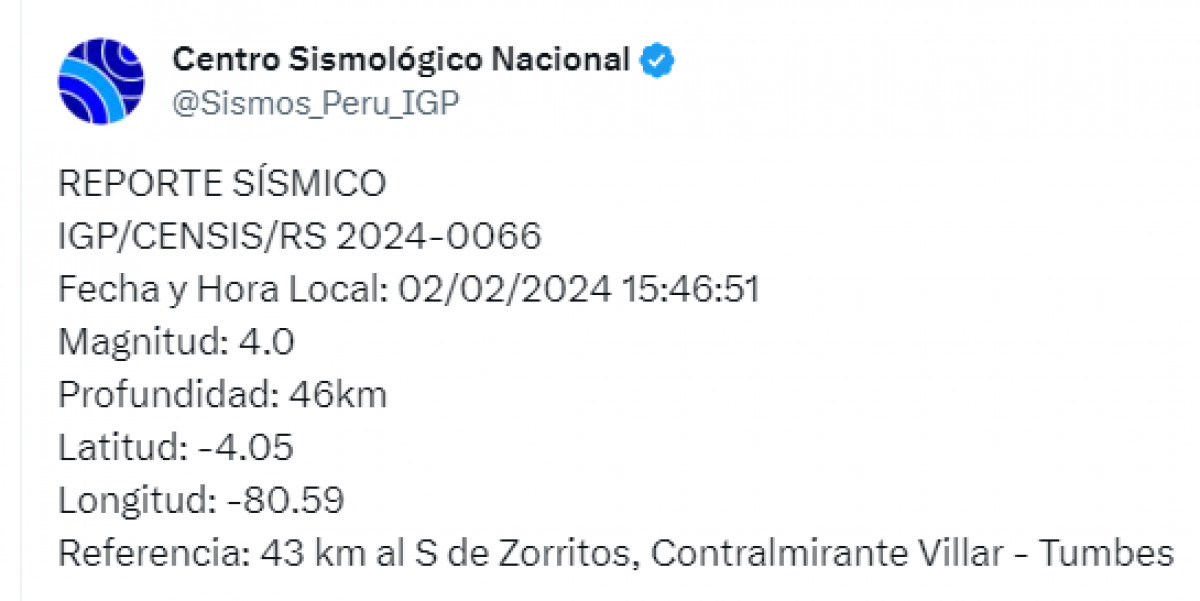 Un sismo de magnitud 4,0 se registró hoy 2 de febrero a las 3:46 p. m. a 46 km. al sur de Zorritos, Contralmirante Villa - Tumbes, según informó el Instituto Geofísico del Perú (IGP) vía Twitter. Recuerda tener siempre lista una mochila de emergencia para estar preparado ante un desastre natural.