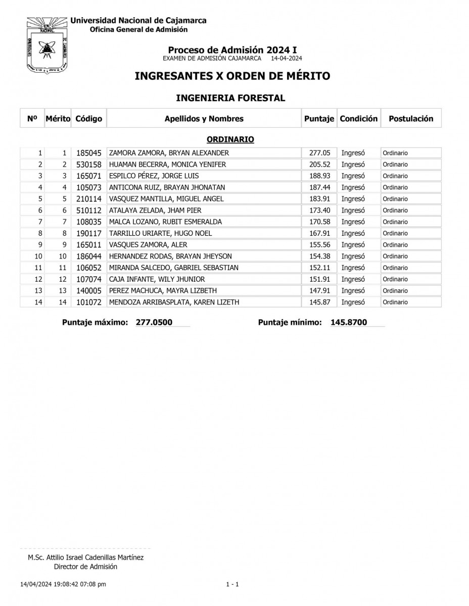 Lista de ingresantes UNC 2024 - I : Ingeniería Forestal