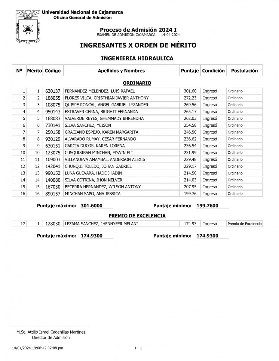 Lista de ingresantes UNC 2024 - I : Ingeniería Hidráulica