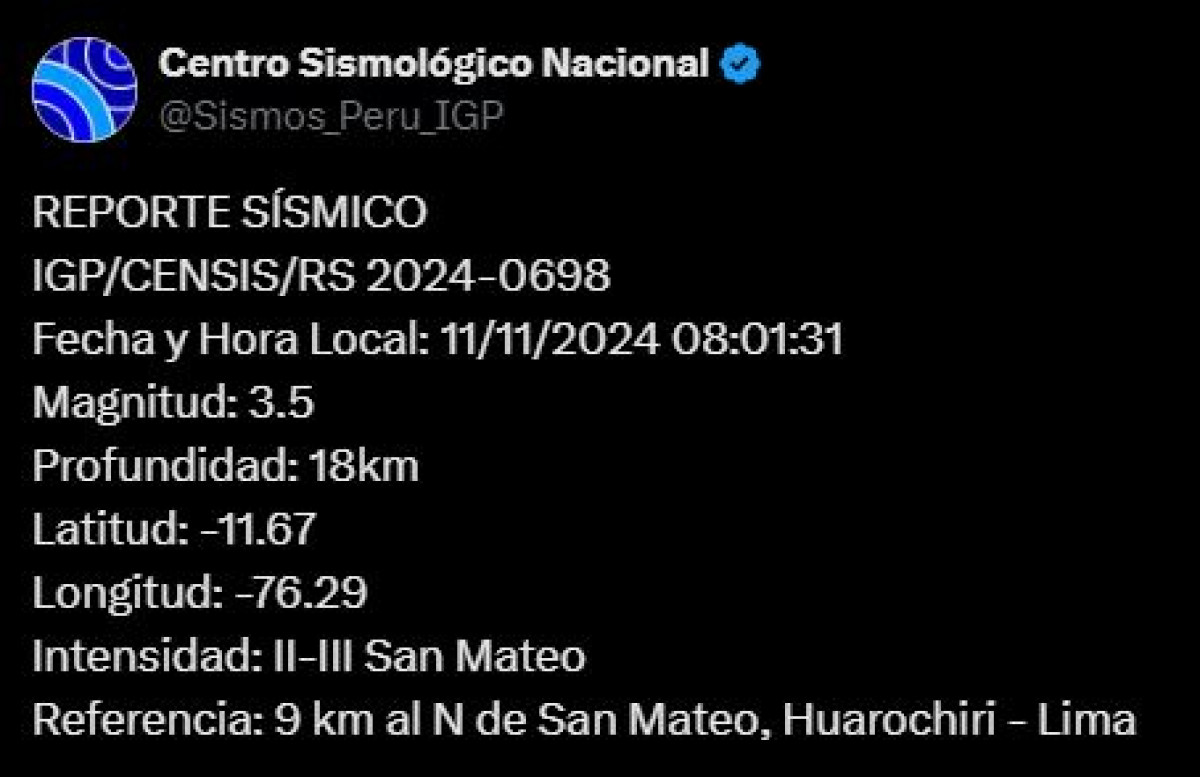 Un sismo de magnitud 3,5 se registró a las 8.01 a. m. a 9 kilómetros al norte de San Mateo, Huarochirí - Lima. El temblor de hoy, 11 de noviembre de 2024, se registró a una profundidad de 18 kilómetros, según informó el Instituto Geofísico del Perú (IGP) vía Twitter. Recuerda tener siempre lista una mochila de emergencia para estar preparado ante un desastre natural.